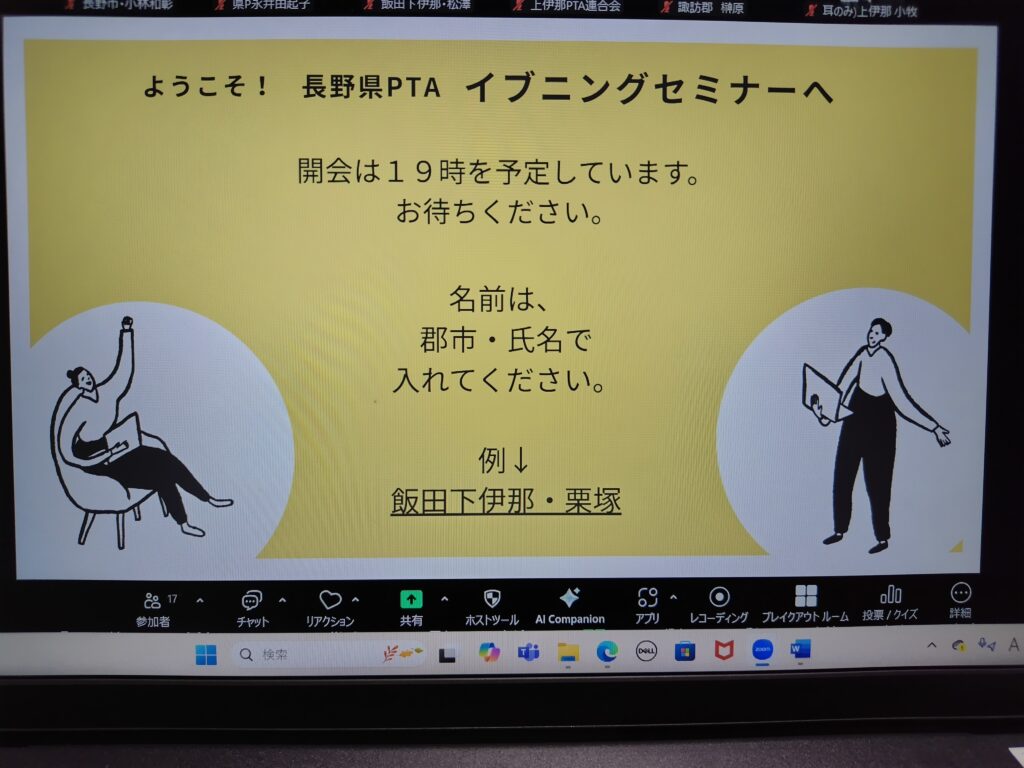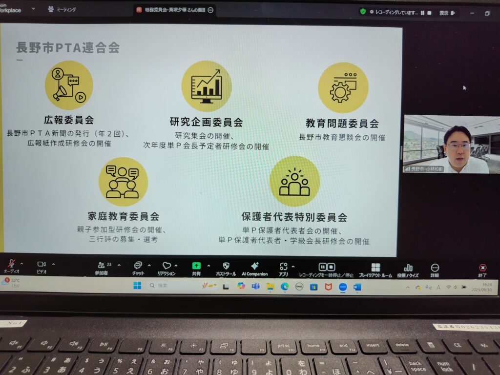 令和7年9月30日(水)に、長野県PTA連合会で初の企画、郡市PTA役員・先生方のための「第1回 長野県PTAイブニングセミナー」をオンラインで開催いたしました。