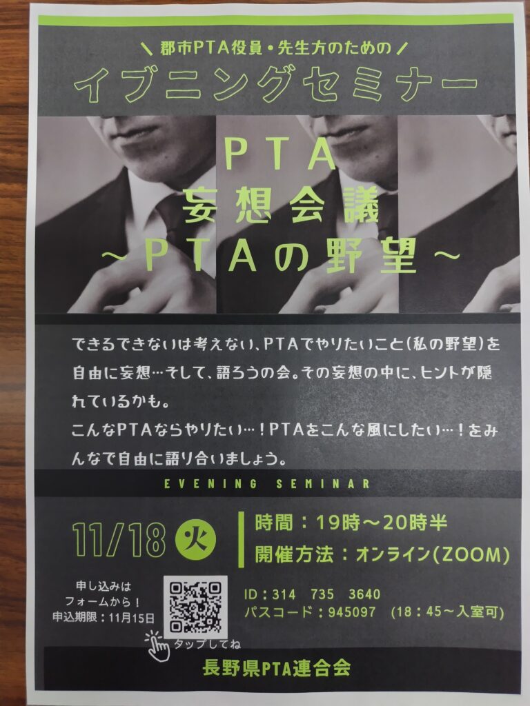 令和7年11月18日火曜日に、第二回イブニングセミナーをオンラインにて開催しました。今回は、できるできないは考えない、PTAでやりたいことを自由に妄想、そして語ろうという「PTA妄想会議」を行いました。参加者が自由に各々の妄想を語り合ったのですが、出るわ出るわ面白い妄想。PTA主催のマラソン大会、PTAアイドルによるショートドラマの作成、学校に職員室ならぬPTA室を作っちゃおう!などなど、びっくりするような妄想の数々。そんなおもしろくてわくわくするような話し合いの時間の中に、今後のPTAをどうしていけばよいのかというヒントを得たような、そんな貴重な時間となりました。みなさんも、各郡市や学校のPTAで、発言に責任を持たない妄想会議を一度やってみてください。参加者からは、「今までやってきたPTAの活動の中で一番楽しい時間だった。」とおっしゃる方もいるくらい楽しいひと時となりました。